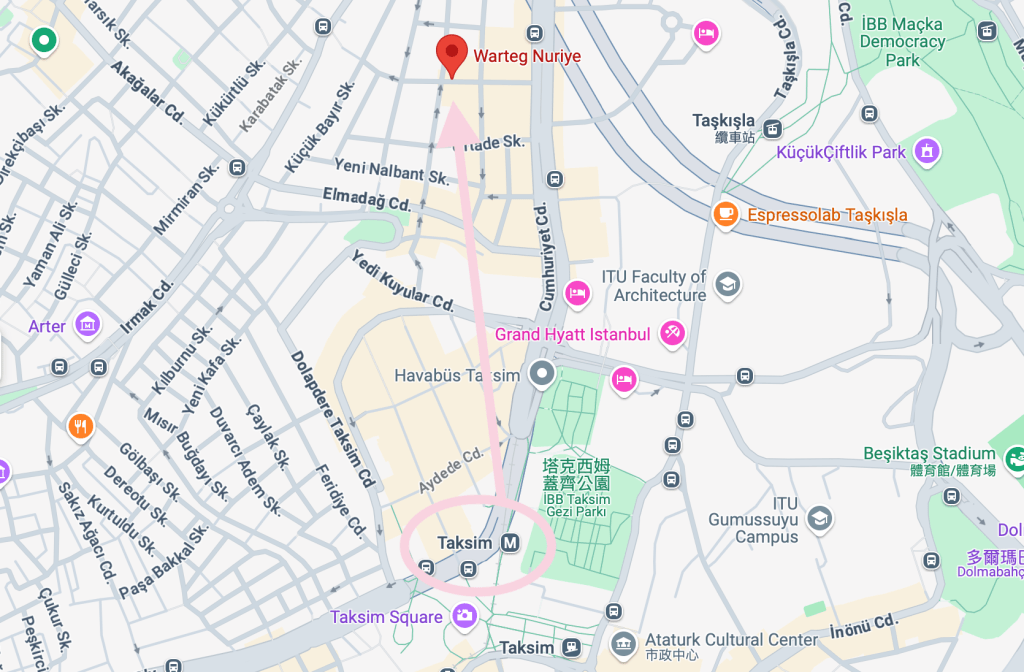 Warteg Nuriye位在伊斯坦堡歐洲岸新城區,離它最近的知名地標就是塔克辛廣場(Taksim Square),大約距離700公尺左右,藏身在一個很不起眼的小巷弄中,沒多看真的不會注意到它。
