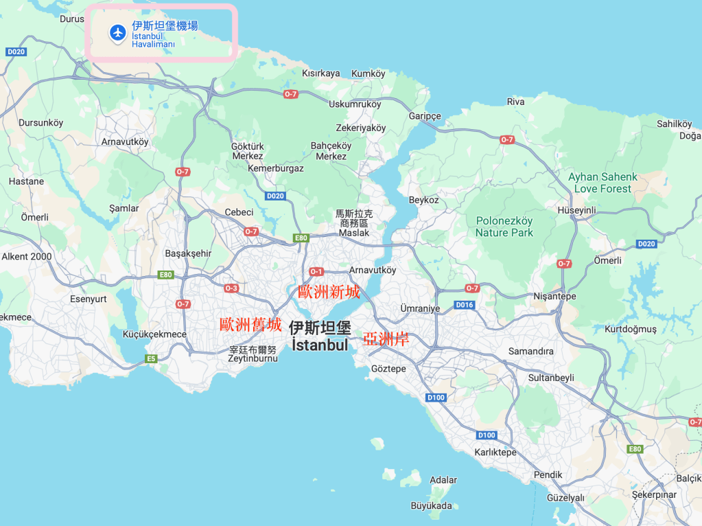 不過,伊斯坦堡機場卻不在這三區裡面,而是位於歐洲新城西北方,靠近黑海沿岸的位置。從機場到市中心(不論是Taksim還是Sultanahmet),直線距離大約35公里,但實際交通時間需視當天路況與交通工具而定。