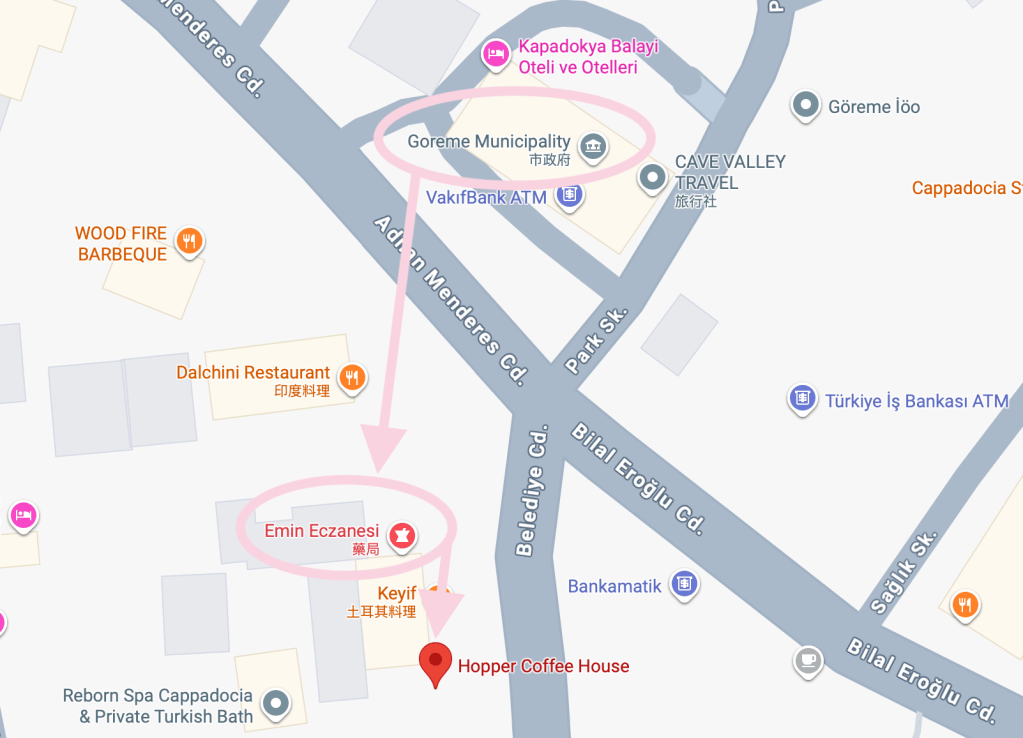 這裡餐廳和商店眾多,最快找到Hopper Coffee的方法:先找出格雷梅市政府(Göreme Municipality),斜對面有間藥局Emin Eczanesi,藥局往左邊第二間就是Hopper Coffee囉!